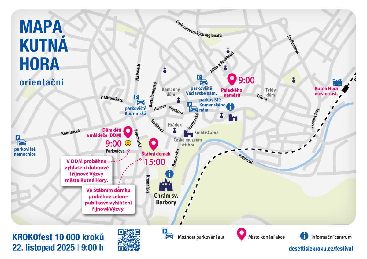 Zveme všechny nadšence chůze a pravidelné účastníky Výzvy 10 000 kroků na KROKOfest 2025 – den, kdy se setká komunita, která miluje každodenní chůzi, ať už ve svém městě nebo po krásách naší země. Přijďte se potkat s týmem, který výzvu připravuje, načerpat nové informace, vychutnat si historii Kutné Hory a navštívit místa, která vám doporučíme v rámci našeho programu. Letos na vás čeká více zajímavých přednášek, nové inspirace a slavnostní vyhlášení výsledků celorepublikové výzvy i místního hodnocení Kutné Hory.