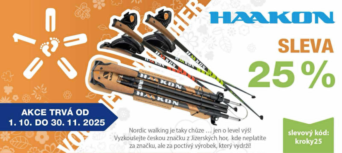 Potřebujete pro vaši Výzvu hůlky na Nordic walking? Využijte 25% slevu na špičkové české hole HAAKON se slevovým kódem kroky25. Nakupovat můžete zde.